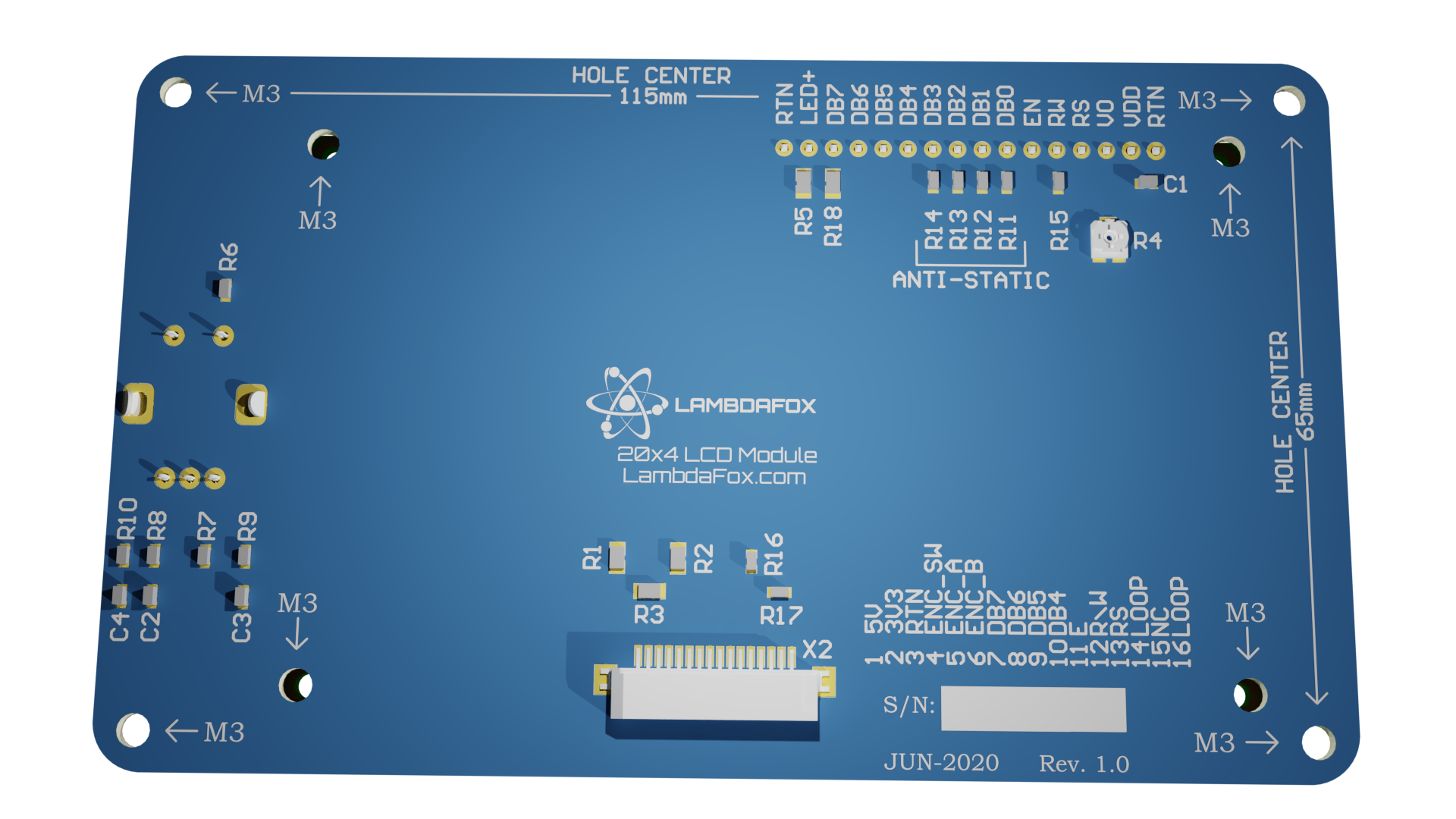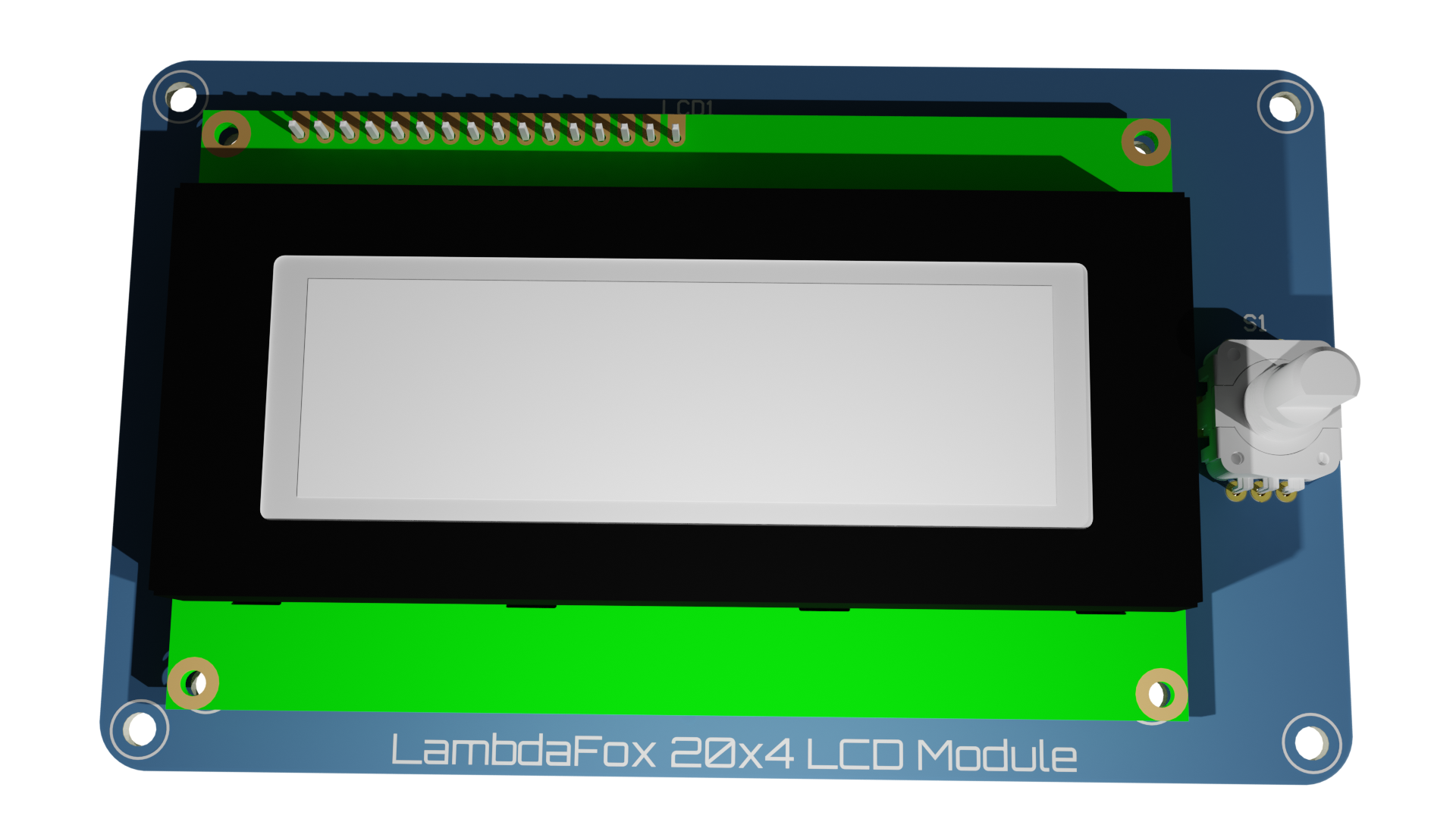 The LCD is our 20x4 LCD module which is connected to our standard flat-flex break-out connector. This LCD uses the standard Hitachi HD44780 compatible interface that most LCDs use these days.