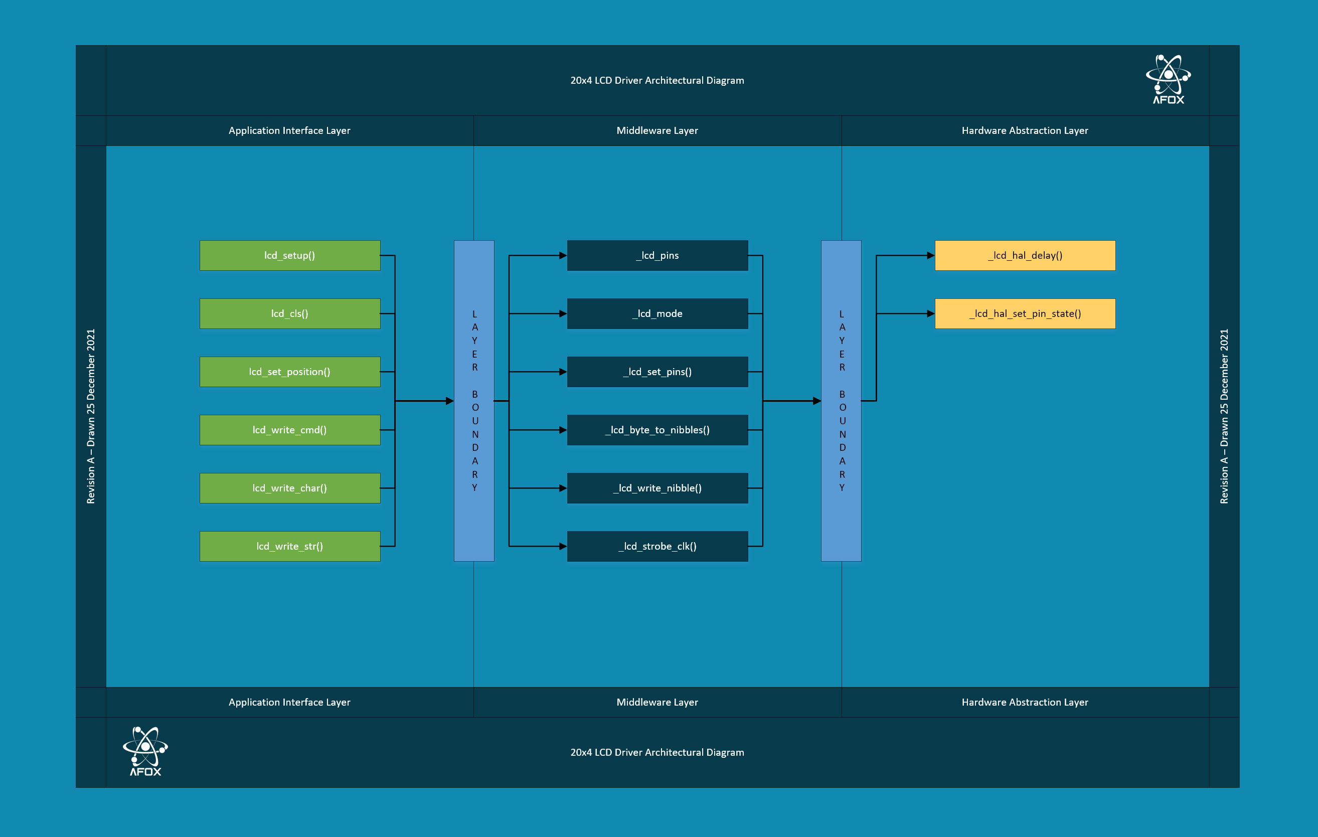 The middleware layer are helper functions that perform actions between the application interface layer and the hardware abstraction layer. These include methods that strobe the LCD clock, split a byte into nibbles for the 4-bit interface, and so forth.