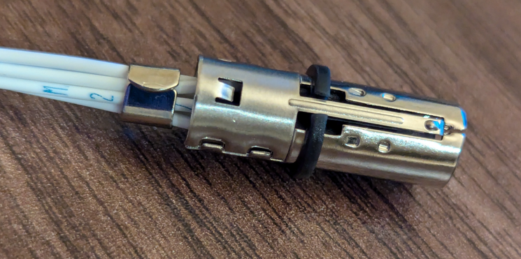 A cable was built using the Kycon connector. This is a solder cup connector so 6 wires approximately 1ft long were prepared and soldered to the connected then assembled and connected to the electronic balance for testing. Kycon has an assembly video for this connector on their website. The assembly was relatively straight forward and produced a nice cable.