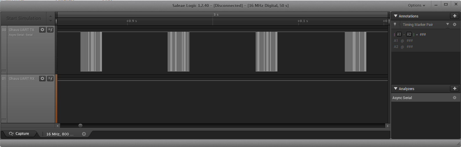 While adjusting the options detect a logic analyzer was connected to the TXD and RXD pins to check for activity. After enabling the automatic print option, message traffic could be seen on the TXD pin. Since this is standard UART an FTDI cable can be used as a virtual COM port.