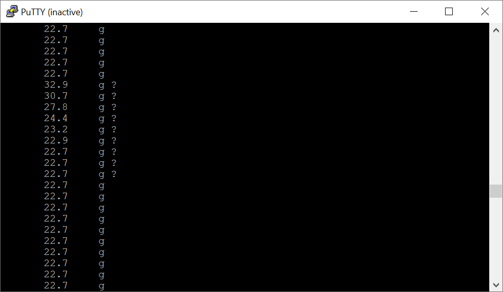 The output includes a question mark when the balance is changing. In the following example light pressure was applied to the balance to cause a shift in output.